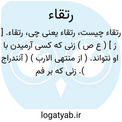 رتقاء. [ رَ ] ( ع ص ) زنی که کسی آرمیدن با او نتواند. ( از منتهی الارب ) ( آنندراج ). زنی که بر فم رحم او غشایی رسته باشد چنانکه مرد بدان سبب با وی مباشرت نتواند کرد و باشد که گوشتی فزونی بود همچون عضله ای و باشد که قرحه ای بوده باشد و باشد که از آفرینش چنان آمده باشد. ( از ذخیره خوارزمشاهی ). خُلَّق. بسته شیب. خلاف فتقاء. بسته ختان. مبتلا به رتق. ( یادداشت مرحوم دهخدا ). زنی که با وی نتوان آرمید. ( از مصادراللغة زوزنی ). زنی که با او دخول نتوان کرد. ( دهار ). زنی که در فرج وی مدخل شرم نباشد و آرامیدن با وی ممکن نبود و یا آنکه در فرج وی جز سوراخ بول سوراخی نبود. ( از ناظم الاطباء ). زنی بسته اندام. ( تاج المصادر بیهقی ) ( مهذب الاسماء ). و رجوع به رَتْق ( ع ص ) شود.