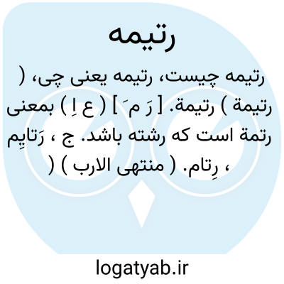( رتیمة ) رتیمة. [ رَ م َ ] ( ع اِ ) بمعنی رتمة است که رشته باشد. ج، رَتایِم، رِتام. ( منتهی الارب ) ( آنندراج ). رشته ای باشد که بر انگشت بندند تا بدان چیزی یاد آید. ج، رتایم. ( مهذب الاسماء ) ( دهار ) ( از اقرب الموارد ). || گرهی باشد که در جاهلیت مسافر وقت سفر دو شاخ درخت را با هم می بست و هرگاه از سفر بازمی آمد اگر آن هر دو شاخ بحال می یافت می گفت که از اهل او خیانت واقع نشده و اگر بحال نیافت می گفت به تحقیق که از اهل او خیانت واقع شده. ( منتهی الارب ) ( آنندراج ) ( ناظم الاطباء ). و رجوع به رتمة شود.