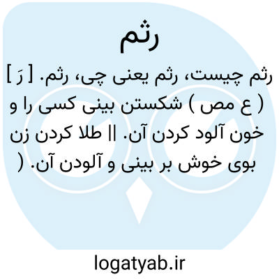 رثم. [ رَ ] ( ع مص ) شکستن بینی کسی را و خون آلود کردن آن. || طلا کردن زن بوی خوش بر بینی و آلودن آن. ( منتهی الارب ) ( آنندراج ) ( از اقرب الموارد ).