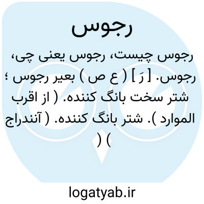 رجوس. [ رَ ] ( ع ص ) بعیر رجوس؛ شتر سخت بانگ کننده. ( از اقرب الموارد ). شتر بانگ کننده. ( آنندراج ) ( منتهی الارب ) ( ناظم الاطباء ). || آسمان سخت غرنده. ( ناظم الاطباء ). || دریای مواج. ( از اقرب الموارد ). || آنکه آب چاه را به مرجاس اندازه می کند. ( ناظم الاطباء ).