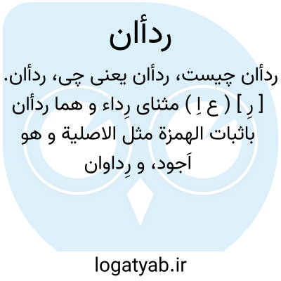 لغت نامه دهخدا ردأان. [ رِ ] ( ع اِ ) مثنای رِداء و هما ردأان باثبات الهمزة مثل الاصلیة و هو اَجود، و رِداوان بقلبها واواً مثل التأنیث. ( منتهی الارب ). رجوع به رداء شود.