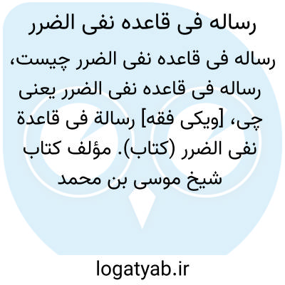 [ویکی فقه] رسالة فی قاعدة نفی الضرر (کتاب). مؤلف کتاب شیخ موسی بن محمد نجفی خوانساری از فقهای شیعه در نیمه اول قرن سیزدهم هجری و از علمای حوزه علمیه نجف اشرف و از بزرگان شاگردان مرحوم نائینی و متوفای سال ۱۳۶۳ هجری قمری است.