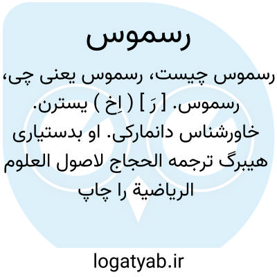 رسموس. [ رَ ] ( اِخ ) یسترن. خاورشناس دانمارکی. او بدستیاری هیبرگ ترجمه الحجاج لاصول العلوم الریاضیة را چاپ کرد و در درس جداول فلکی با محمدبن موسی خوارزمی همکاری کرد. رسموس به سال 1847م. دیده بر جهان گشود و به سال 1921 درگذشت. ( از اعلام المنجد ).