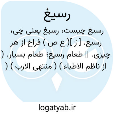 رسیغ. [ رَ ]( ع ص ) فراخ از هر چیزی. || طعام رسیغ؛ طعام بسیار. ( از ناظم الاطباء ) ( منتهی الارب ) ( آنندراج ).