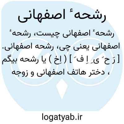 رشحه اصفهانی. [ رَ ح َ ی ِ اِ ف َ ] ( اِخ ) یا رشحه بیگم، دختر هاتف اصفهانی و زوجه میرزا علی اکبر نظیری. هدایت گوید: از موزونان و متوسطان آن شهر ارم بهر بوده و در خدمت آقا محمکاظم واله اکتساب کمال کرده. از اوست: