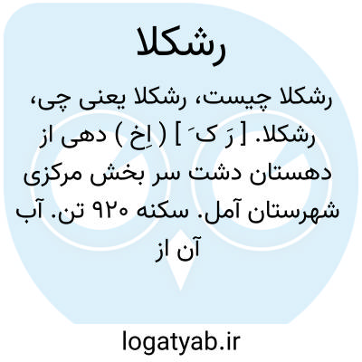 رشکلا. [ رَ ک َ ] ( اِخ ) دهی از دهستان دشت سر بخش مرکزی شهرستان آمل. سکنه 920 تن. آب آن از رودخانه هراز. محصولات عمده برنج و صیفی و غلات. اکثر سکنه در تابستان به ییلاقهای لاریجان می روند. ( از فرهنگ جغرافیایی ایران ج 3 ).