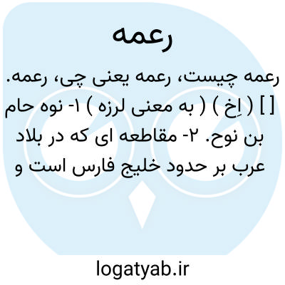 لغت نامه دهخدا رعمه. [ ] ( اِخ ) ( به معنی لرزه ) 1- نوه حام بن نوح. 2- مقاطعه ای که در بلاد عرب بر حدود خلیج فارس است و در عطریات و سنگهای گرانبها و طلا با صور تجارت میداشت گویند اهالی این شهر ازذریه رعمه نوه حام می باشند. ( قاموس کتاب مقدس ).