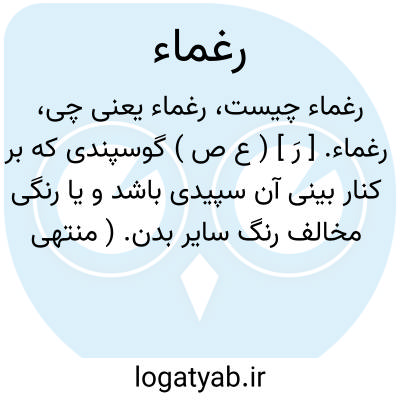 لغت نامه دهخدا رغماء. [ رَ ] ( ع ص ) گوسپندی که بر کنار بینی آن سپیدی باشد و یا رنگی مخالف رنگ سایر بدن. ( منتهی الارب ) ( آنندراج ) ( ناظم الاطباء ).