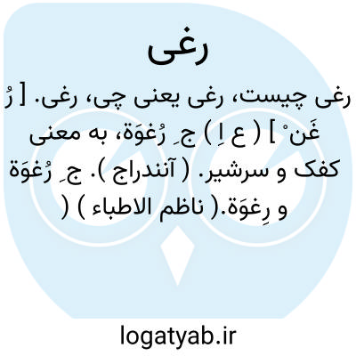 رغی. [ رُ غَن ْ ] ( ع اِ ) ج ِ رُغوَة، به معنی کفک و سرشیر. ( آنندراج ). ج ِ رُغوَة و رِغوَة.( ناظم الاطباء ) ( منتهی الارب ). رجوع به رِغوَة شود.