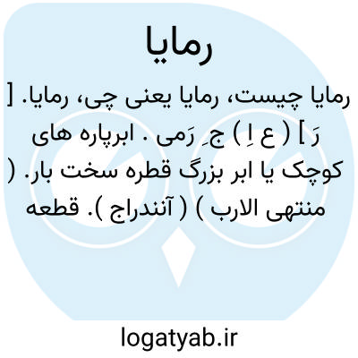 رمایا. [ رَ ] ( ع اِ ) ج ِ رَمی. ابرپاره های کوچک یا ابر بزرگ قطره سخت بار. ( منتهی الارب ) ( آنندراج ). قطعه های کوچک ابر یا ابر بزرگ قطره سخت بار که از ابرهای بعد از تخفیف گرما و پائیز باشد. ( از اقرب الموارد ). || ج ِ رَمیّة، بمعنی شکار به تیر افکنده. ( از منتهی الارب ). شکار ماده یا نر که به تیر افکنده باشند. ( از اقرب الموارد ).