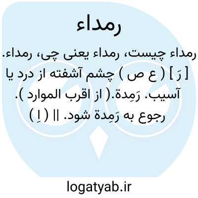 رمداء. [ رَ ] ( ع ص ) چشم آشفته از درد یا آسیب. رَمِدة.( از اقرب الموارد ). رجوع به رَمِدة شود. || ( اِ ) شترمرغ. ( منتهی الارب ). نعامة. ( اقرب الموارد ). شترمرغ بدان جهت که خاکستری رنگ است. ( آنندراج ).