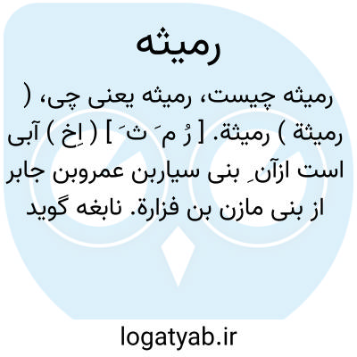 ( رمیثة ) رمیثة. [ رُ م َ ث َ ] ( اِخ ) آبی است ازآن ِ بنی سیاربن عمروبن جابر از بنی مازن بن فزارة. نابغه گوید: و علی الرمیثة من سکین حاضر و علی الدثینة من بنی سیار.( از معجم البلدان ). رمیثة. [ رُ م َ ث َ ] ( اِخ ) ناحیه ای است در قضاء سماوة از کشور عراق، سرزمینی است خوش آب و هوا. الوجه و الابیض نیز نامیده می شود. ( از اعلام المنجد ).