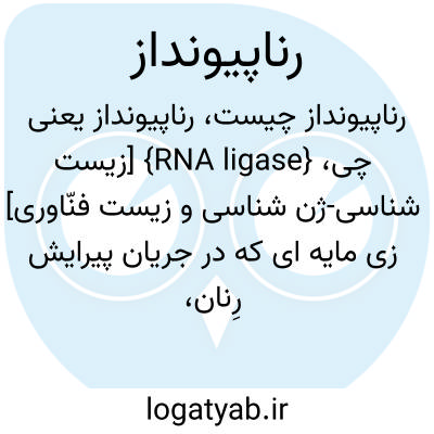 {RNA ligase} [زیست شناسی-ژن شناسی و زیست فنّاوری] زی مایه ای که در جریان پیرایش رِنان، با پیوند فسفودی استری، دو بیانه در یک پیش رِنان را به هم متصل می کند