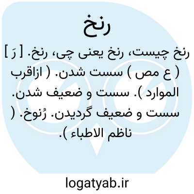 رنخ. [ رَ ] ( ع مص ) سست شدن. ( ازاقرب الموارد ). سست و ضعیف شدن. سست و ضعیف گردیدن. رُنوخ. ( ناظم الاطباء ).