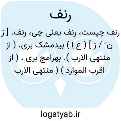 رنف. [ رَ ن َ / رَ ] ( ع اِ ) بیدمشک بری. ( از منتهی الارب ). بهرامج بری. ( از اقرب الموارد ) ( منتهی الارب ). بهرامج است که بیدمشک باشد بلغت بربری و بعضی گویند عربی است.( برهان قاطع ). بهرامج. ( اختیارات بدیعی ). از درختان کوهستانی و معروف به خلاف بلخی است و بهرامج بری نیزگفته می شود و آن درختی است که بشب برگهای خود را به شاخه ها چسباند و چون روز شود باز و جدا شوند. ( از الجماهر بیرونی ). || لاله. ( مهذب الاسماء ).