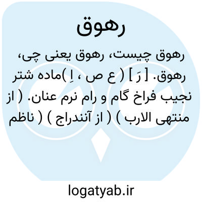 رهوق. [ رَ ] ( ع ص، اِ )ماده شتر نجیب فراخ گام و رام نرم عنان. ( از منتهی الارب ) ( از آنندراج ) ( ناظم الاطباء ) ( از اقرب الموارد ).