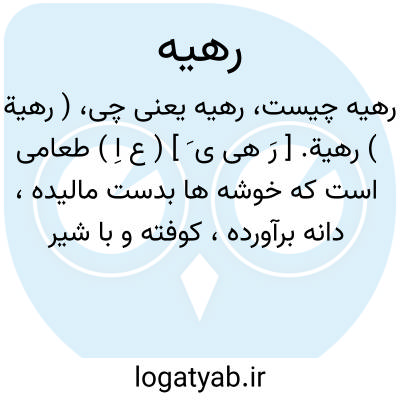 ( رهیة ) رهیة. [ رَ هی ی َ ] ( ع اِ ) طعامی است که خوشه ها بدست مالیده، دانه برآورده، کوفته و با شیر آمیخته، طبخ دهند. ( منتهی الارب ) ( آنندراج ) ( ازاقرب الموارد ). گندم به شیر پخته. ( مهذب الاسماء ).
