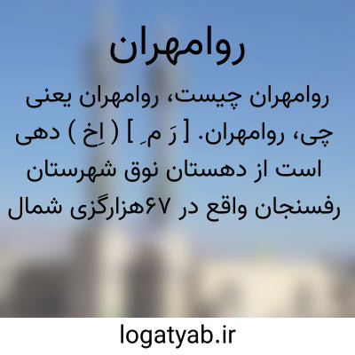 روامهران. [ رَ م ِ ] ( اِخ ) دهی است از دهستان نوق شهرستان رفسنجان واقع در 67هزارگزی شمال باختری رفسنجان در کنار راه مالرو رفسنجان به بافق. جلگه و سردسیر و دارای 225 تن سکنه است. آب آن از قنات تأمین میشود و محصول آن غلات و پسته و پنبه و شغل مردم زراعت و گلیم بافی است. راه فرعی دارد. ( از فرهنگ جغرافیایی ایران ج 8 ).