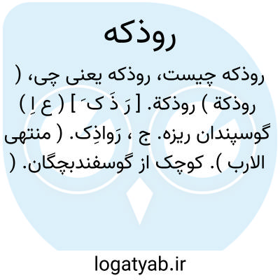 ( روذکة ) روذکة. [ رَ ذَ ک َ ] ( ع اِ ) گوسپندان ریزه. ج، رَواذِک. ( منتهی الارب ). کوچک از گوسفندبچگان. ( از اقرب الموارد ).