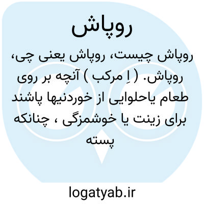 لغت نامه دهخدا روپاش. ( اِ مرکب ) آنچه بر روی طعام یاحلوایی از خوردنیها پاشند برای زینت یا خوشمزگی، چنانکه پسته خردکرده بر روی شله زرد و قیمه بر روی آش رشته. ( یادداشت مؤلف ). || آنچه بر روی مسهل و منضج از دواهای خشک پاشند. ( یادداشت مؤلف ).
