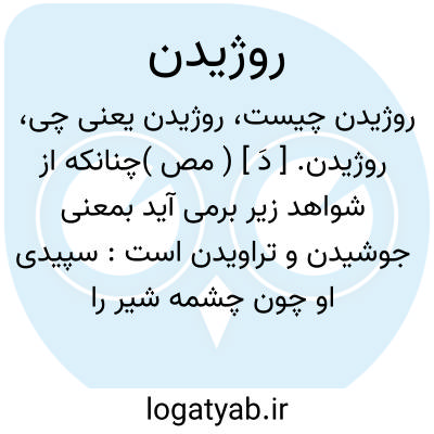 روژیدن. [ دَ ] ( مص )چنانکه از شواهد زیر برمی آید بمعنی جوشیدن و تراویدن است: سپیدی او چون چشمه شیر را ماند که چشمه چشمه برمیروژد. ( کتاب المعارف ). می اندیشیدم که این اجزای ما چندین هزار همسایه یافته است و این حرف اندیشه های ما چون سبزه و زعفران از کدام سینه ها رسته است و یا چون مورچه از عارض و نگین کدام خوبان روژیده است. ( کتاب المعارف ). اکنون معنی از تو همچون آبیست که بوقت بیداری از دلت بیرون میروژد و در تنت پراکنده میشود. رجوع به روزیدن شود. ( کتاب المعارف ).