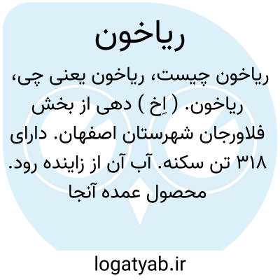 ریاخون. ( اِخ ) دهی از بخش فلاورجان شهرستان اصفهان. دارای 318 تن سکنه. آب آن از زاینده رود. محصول عمده آنجا غلات و برنج و صیفی و پنبه و صنایع دستی زنان آنجا کرباس بافی و راه آن فرعی است. ( از فرهنگ جغرافیایی ایران ج 10 ).