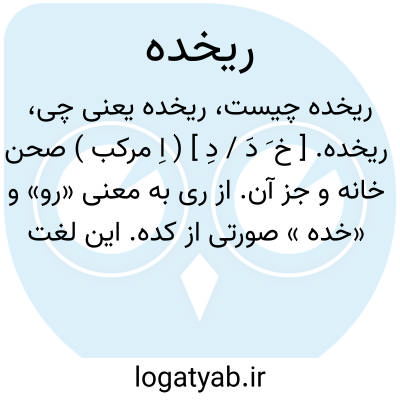 ریخده. [ خ َ دَ / دِ ] ( اِ مرکب ) صحن خانه و جز آن. از ری به معنی «رو» و «خده » صورتی از کده. این لغت در یزد و خاصه نزد زردشتیان آنجا معمول است. ( یادداشت مؤلف ).