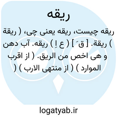 لغت نامه دهخدا ( ریقة ) ریقة. [ ق َ ] ( ع اِ ) ریقه. آب دهن و هی اخص من الریق. ( از اقرب الموارد ) ( از منتهی الارب ) ( از آنندراج ) ( ناظم الاطباء ).