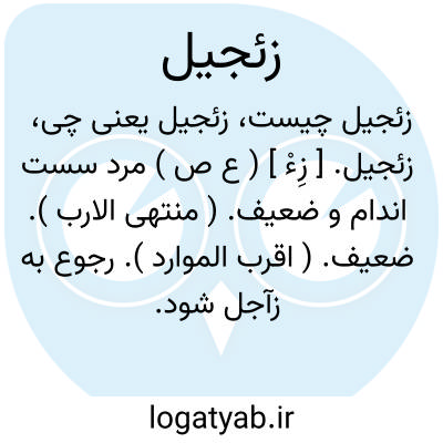 لغت نامه دهخدا زئجیل. [ زِءْ ] ( ع ص ) مرد سست اندام و ضعیف. ( منتهی الارب ). ضعیف. ( اقرب الموارد ). رجوع به زآجل شود.