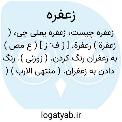 ( زعفرة ) زعفرة. [ زَ ف َ رَ ] ( ع مص ) به زعفران رنگ کردن. ( زوزنی ). رنگ دادن به زعفران. ( منتهی الارب ) ( از ناظم الاطباء ) ( از اقرب الموارد ) ( آنندراج ). رنگ زعفرانی دادن. ( یادداشت به خط مرحوم دهخدا ). رنگ کردن با زعفران. || زرد شدن چون زعفران. || بر روی پوشیدن لباس زعفرانی رنگ. ( از دزی ایضاً 592 ). || زعفران زدن طعام را. ( از اقرب الموارد ). به همه معانی رجوع به زعفران شود.