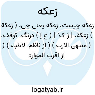( زعکة ) زعکة. [ زَ ک َ ] ( ع اِ ) درنگ. توقف. ( منتهی الارب ) ( از ناظم الاطباء ) ( از اقرب الموارد ). یقال: لهم زعکة فی المکان؛ ای لبئة. ( از اقرب الموارد ) ( از ناظم الاطباء ). || در آفریقا بمعنی عقب. کون. دم. ( از دزی ج 1 ص 593 ).
