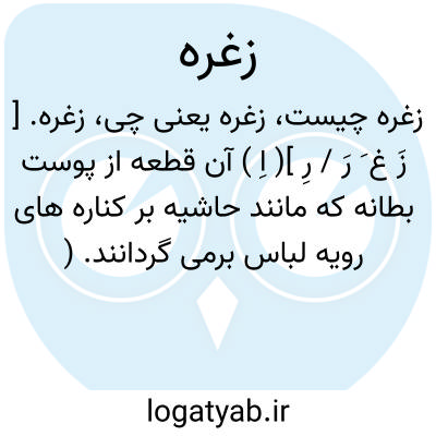 زغره. [ زَ غ َ رَ / رِ ]( اِ ) آن قطعه از پوست بطانه که مانند حاشیه بر کناره های رویه لباس برمی گردانند. ( ناظم الاطباء ). قسمت مشهود از خز و سنجاب و دیگر پوستهای آستر خرقه و جبه و لباده در اطراف جامه. آنچه از بیرون دیده شود حاشیه از خز و سنجاب که بطانه باشد. در جبه و... آنچه چون سجافی از اطراف گریبان و در بر شکاف جلو ظاهر باشد از مؤئینه ها. ( از یادداشتهای بخط مرحوم دهخدا ).