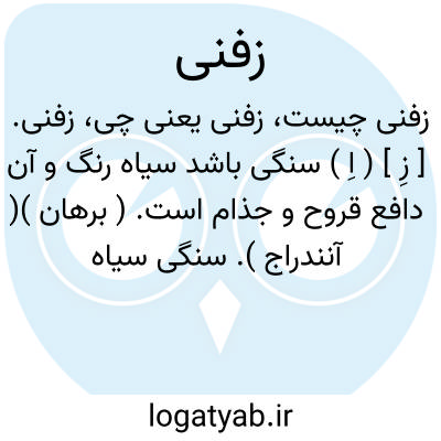زفنی. [ زِ ] ( اِ ) سنگی باشد سیاه رنگ و آن دافع قروح و جذام است. ( برهان )( آنندراج ). سنگی سیاه رنگ و دوائی. ( ناظم الاطباء ).