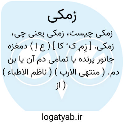زمکی. [ زِم ِک ْ کا ] ( ع اِ ) دمغزه جانور پرنده یا تمامی دم آن یا بن دم. ( منتهی الارب ) ( ناظم الاطباء ) ( از اقرب الموارد ). در شرح نصاب بمعنی دم مرغ و در شرحی بمعنی بیخ دم طائر نوشته و در منتخب محل روئیدن دم مرغ. ( آنندراج ). زِمِجّی ̍. رجوع به همین کلمه و زِمِک شود.