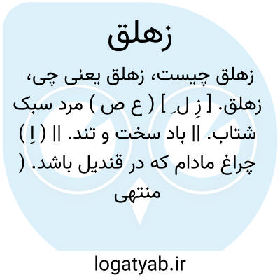 زهلق. [ زِ ل ِ ] ( ع ص ) مرد سبک شتاب. || باد سخت و تند. || ( اِ ) چراغ مادام که در قندیل باشد. ( منتهی الارب ) ( آنندراج ) ( ناظم الاطباء ) ( از اقرب الموارد ).