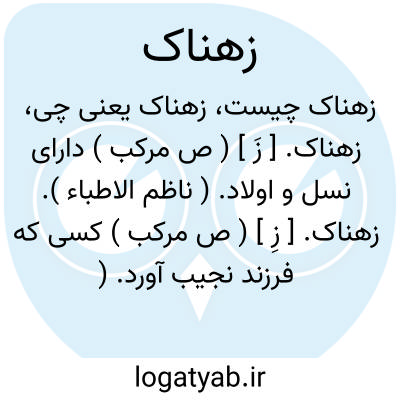 لغت نامه دهخدا زهناک. [ زَ ] ( ص مرکب ) دارای نسل و اولاد. ( ناظم الاطباء ).زهناک. [ زِ ] ( ص مرکب ) کسی که فرزند نجیب آورد. ( ناظم الاطباء )