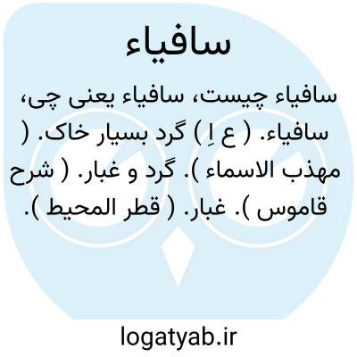 لغت نامه دهخدا سافیاء. ( ع اِ ) گرد بسیار خاک. ( مهذب الاسماء ). گرد و غبار. ( شرح قاموس ). غبار. ( قطر المحیط ). غبار باد برده. باد غبار برداشته. ( منتهی الارب ) ( آنندراج ). بادی است که برمیدارد خاک را. ( شرح قاموس ). بادی که خاک فراوان بهمراه دارد و بمردم هجوم میکند.