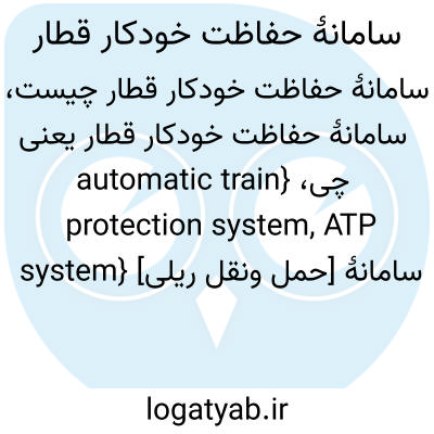 {automatic train protection system, ATP system} [حمل ونقل ریلی] سامانۀ ایمنی ای که بر سرعت حرکت و سرعت هدف قطار نظارت می کند و راننده را از الزام به ترمزگیری در مواقع مورد نیاز آگاه می سازد و در صورت عدم اقدام راننده، به طور خودکار سرعت را کاهش می دهد و قطار را متوقف می کند