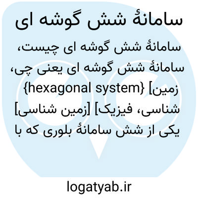 {hexagonal system} [زمین شناسی، فیزیک] [زمین شناسی] یکی از شش سامانۀ بلوری که با یک محور سه تایه (threefold ) یا تقارن شش تایه (sixfold ) مشخص می شود متـ. سامانۀ شش گوش [فیزیک] سامانه ای بلوری که یکی از محورهای خانک واحد آن بر دو محور دیگر عمود است و این دو محور با هم...