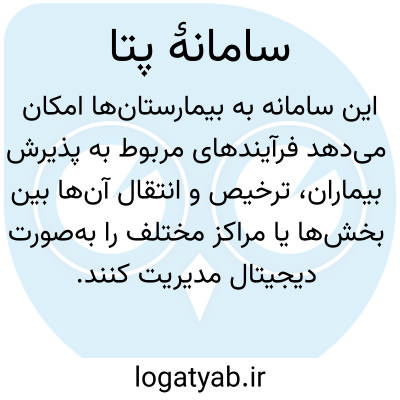 سامانۀ پتا مخفف «سامانۀ پذیرش، ترخیص و انتقال» است و در حوزه مدیریت سلامت کاربرد دارد. این سامانه به بیمارستانها و مراکز درمانی امکان میدهد فرآیندهای مربوط به پذیرش بیماران، ترخیص و انتقال آنها بین بخشها یا مراکز مختلف را بهصورت دیجیتال و سازمانیافته مدیریت کنند. استفاده از چنین سامانهای باعث افزایش دقت و سرعت در مدیریت پروندهها و خدمات درمانی میشود.
