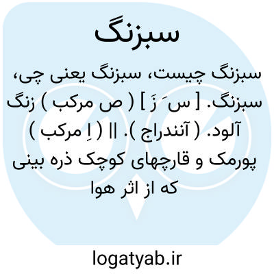 سبزنگ. [ س َ زَ ] ( ص مرکب ) زنگ آلود. ( آنندراج ). || ( اِ مرکب ) پورمک و قارچهای کوچک ذره بینی که از اثر هوا و حرارت مرطوب در روی مواد حیوانی و نباتی پدید می آید و آنها را فاسد و بدطعم میکند. ( ناظم الاطباء ).