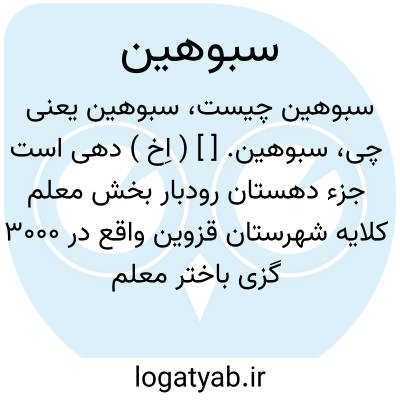 سبوهین. [ ] ( اِخ ) دهی است جزء دهستان رودبار بخش معلم کلایه شهرستان قزوین واقع در 3000 گزی باختر معلم کلایه. هوای آن سرد و دارای 368 تن سکنه است. آب آنجا از چشمه سار تأمین میشود. محصول آن غلات، لوبیا، گردو و شغل اهالی زراعت.معدن زغال سنگ دارد که استخراج میشود. راه آن مالرو است. ( از فرهنگ جغرافیایی ایران ج 1 ).