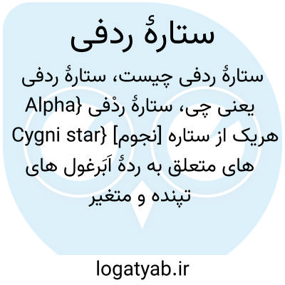 فرهنگستان زبان و ادب ستارۀ ردْفی{Alpha Cygni star} [نجوم] هریک از ستاره های متعلق به ردۀ اَبَرغول های تپنده و متغیر