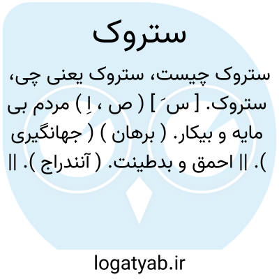 ستروک. [ س َ ] ( ص، اِ ) مردم بی مایه و بیکار. ( برهان ) ( جهانگیری ). || احمق و بدطینت. ( آنندراج ). || بدخو و خشمناک. ( برهان ) ( جهانگیری ). ستیزه جو و جنگجو و خشمناک و بدخو. ( ناظم الاطباء ). مرد ستیزنده. ( آنندراج ). دزد پیشه. ( برهان ) ( جهانگیری ). مرد دزد پیشه. ( ناظم الاطباء ). آنکه بدزدی و خیانت خو دارد.( آنندراج ). || هرزه گو. ( برهان ). یاوه گو.( جهانگیری ). رفیق و مصاحب هرزه گو. ( ناظم الاطباء ).
