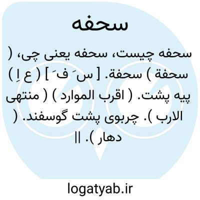 ( سحفة ) سحفة. [ س َ ف َ ] ( ع اِ ) پیه پشت. ( اقرب الموارد ) ( منتهی الارب ). چربوی پشت گوسفند. ( دهار ). || پیه. ( منتهی الارب ). || آواز دوشیدن شیر. ( منتهی الارب ) ( اقرب الموارد ).