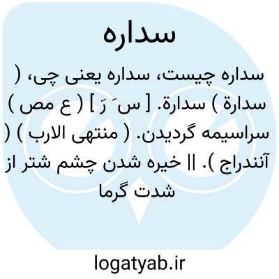 ( سدارة ) سدارة. [ س َ رَ ] ( ع مص ) سراسیمه گردیدن. ( منتهی الارب ) ( آنندراج ). || خیره شدن چشم شتر از شدت گرما یا از شدت سرما. ( منتهی الارب ) ( آنندراج ). سرگشته شدن شتر از گرما... ( تاج المصادر بیهقی ).