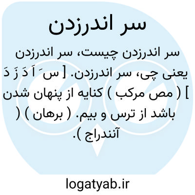 سر اندرزدن. [ س َ اَ دَ زَ دَ ] ( مص مرکب ) کنایه از پنهان شدن باشد از ترس و بیم. ( برهان ) ( آنندراج ). || کنایه از سر در گریبان فروبردن. متفکر و متحیر بودن. ( برهان ). سر در گریبان بردن از حیرت و فکرت. ( رشیدی ).