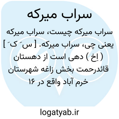 سراب میرکه. [ س َ ک َ ] ( اِخ ) دهی است از دهستان قائدرحمت بخش زاغه شهرستان خرم آباد واقع در 16 هزارگزی شمال خاوری زاغه و 5 هزارگزی شمال راه شوسه خرم آباد به بروجرد. هوای آنجا سرد و دارای 54 تن سکنه است. آب آنجا از سرآب میرکه تأمین می شود. محصول آنجا غلات، لبنیات و شغل اهالی زراعت و گله داری است. صنایع دستی زنان، فرش و جاجیم بافی و مزرعه ای بنام تنگ محمدخان جزء این آبادی است. راه آن مالرو است. ( از فرهنگ جغرافیایی ایران ج 6 ).