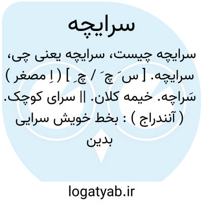سرایچه. [ س َ چ َ / چ ِ ] ( اِ مصغر ) سَراچه. خیمه کلان. || سرای کوچک. ( آنندراج ): بخط خویش سرایی بدین نیکویی و چندین سرایچه ها و میدانها... ( تاریخ بیهقی چ ادیب ص 144 ). امیر برخاست و به سرایچه خاص رفت. ( تاریخ بیهقی چ ادیب ص 511 ). آنگاه این سرایچه را ویران کنیم و سرایچه ای دیگر بنا کنیم. ( معارف بهأولد ).