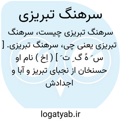 سرهنگ تبریزی. [ س َ هََ گ ِ ت َ ] ( اِخ ) نام او حسنخان از نجبای تبریز و آبا و اجدادش در آن ولایت معروف و سلسله ایشان بسرداری و کلانتری مشهور و خود او خدمتگذار نایب السلطنه بود و منصب سرهنگی داشته است... سرهنگ را طبعی خوش است و گاه به غزلیات می پرداخته از او است: